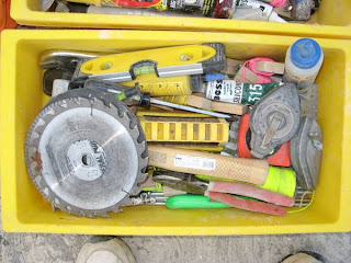 Our first task was to retrieve our tools from the storage compartment under the front steps at Camino, Verdad y Vida Church (The Way, The Truth, and The Life). Both our tools and the tools that the Senior Highs use are stored in this space and it is full and pretty akward to get into! We decided to pull out everything and do an inventory of all the tools. This turned into about a three hour project with lots of dirt and dust. It is a mundane but very necessary task. We verified that all the power tools were functional and then made an equal distribution of tools back into the storage boxes. Here are some pictures of the 'cave' and the tools being sorted.